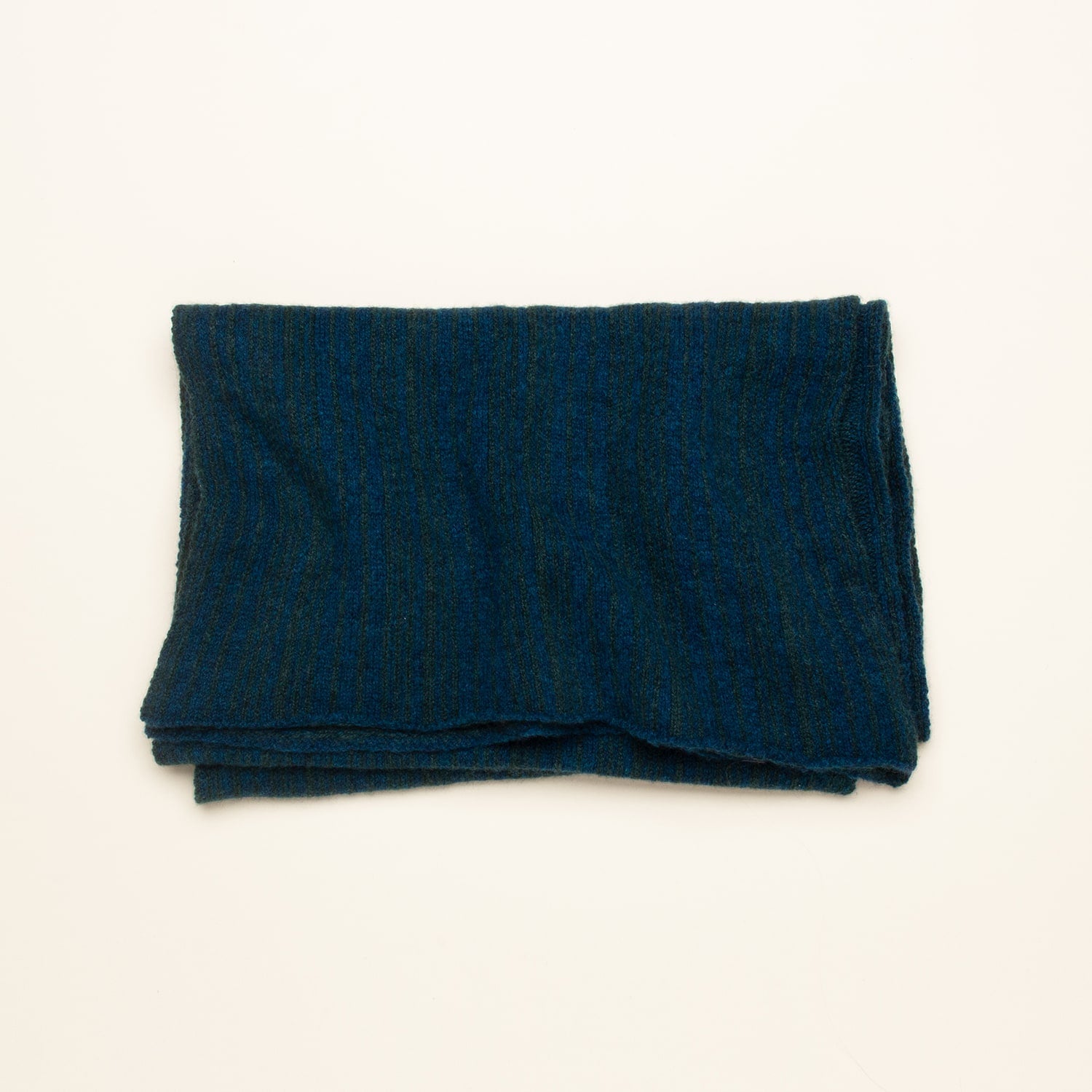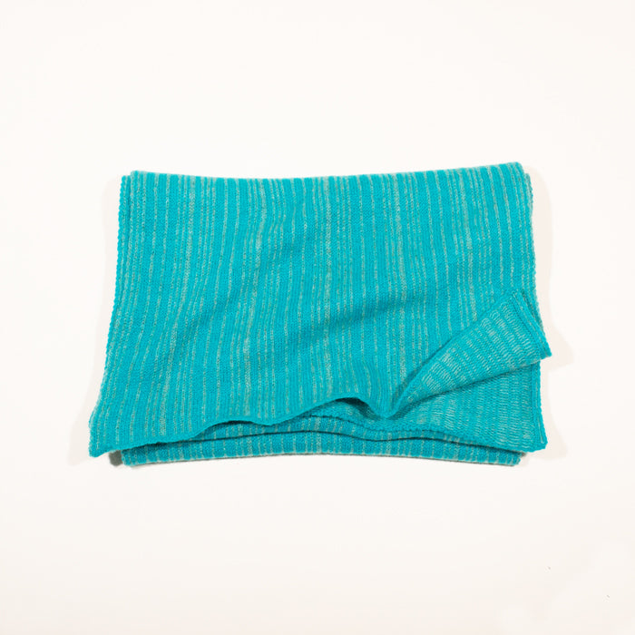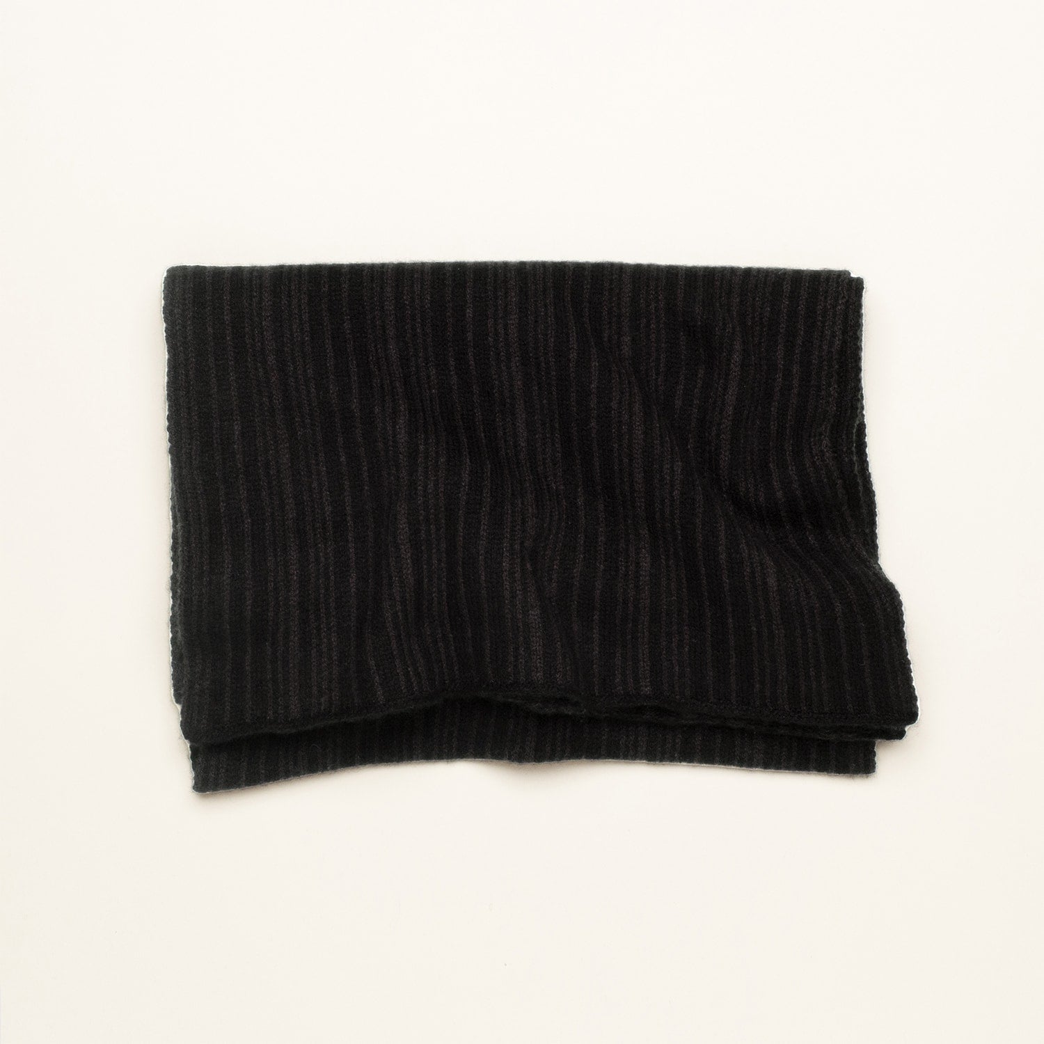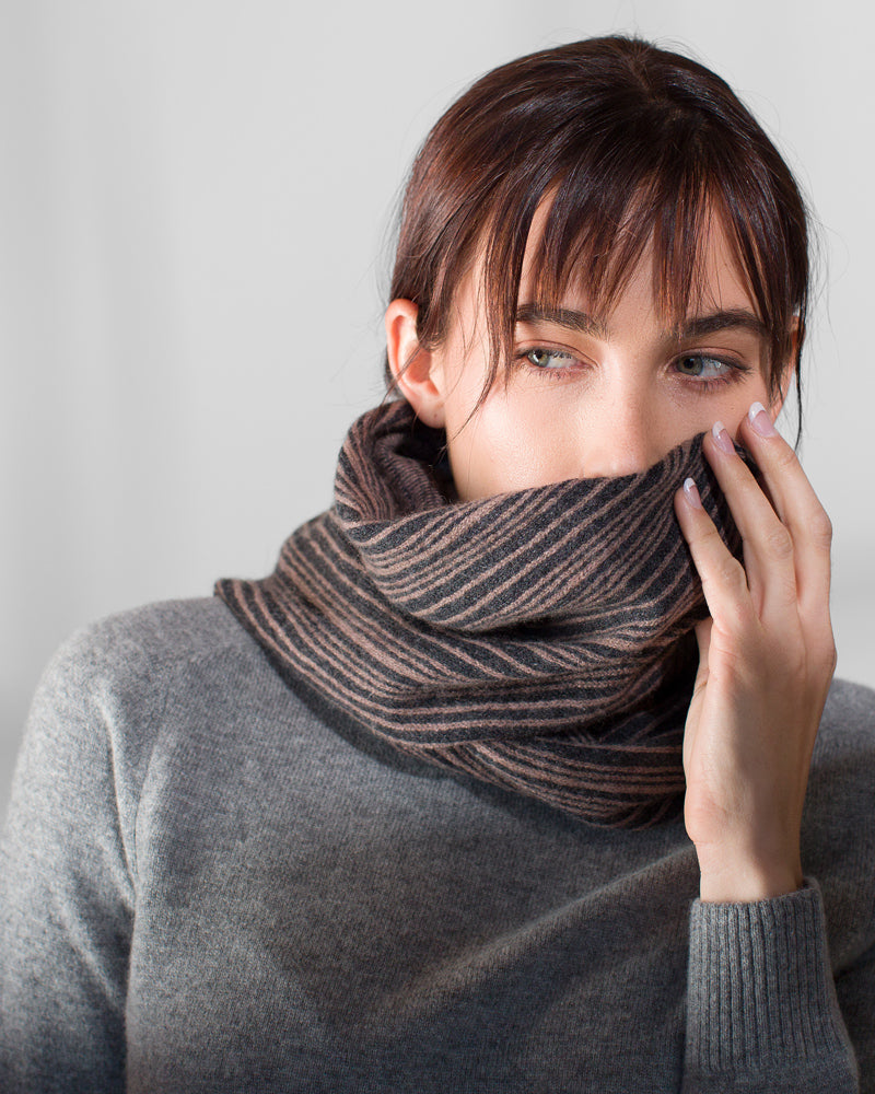Nº 225: Unexpected delight in the details. Each scarf is totally unique, with subtle and structured color play—the front is a vertical striping in a random pattern, the backside features horizontal yarn floats. The Striped Scarf is a creative challenge for our expert knitters. A cashmere scarf that's just your own.